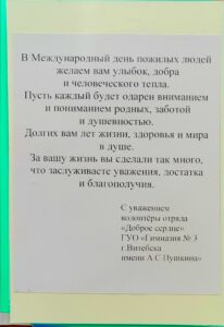 01.10.2025В рамках республиканской кампании Белорусского Красного Креста «Ваша Дапамога» мы проводим цикл мероприятий, посвященных Международному дню пожилых людей. Наша цель — поздравить одиноких пожилых граждан и инвалидов, подарить им тепло и заботу!