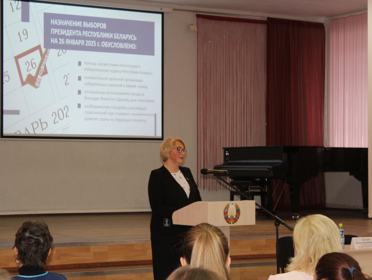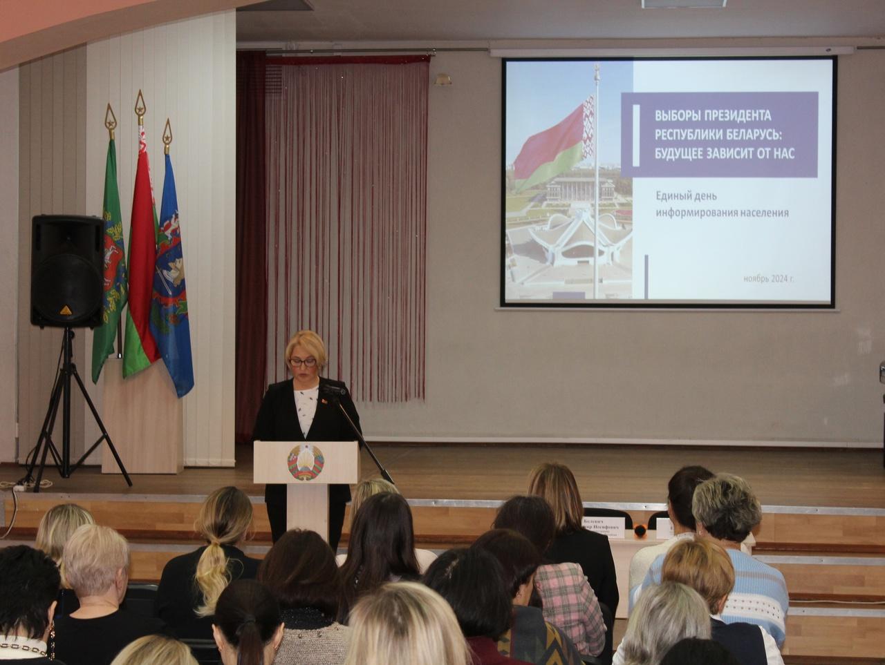 Елена Петровна обозначила главные аспекты электоральной кампании, акцентировала внимание присутствующих в зале на то, что наша страна обеспечивает себя во всех важных сферах жизни, остановилась на тех достижениях последних лет, которыми может гордиться суверенная и независимая Республика Беларусь.