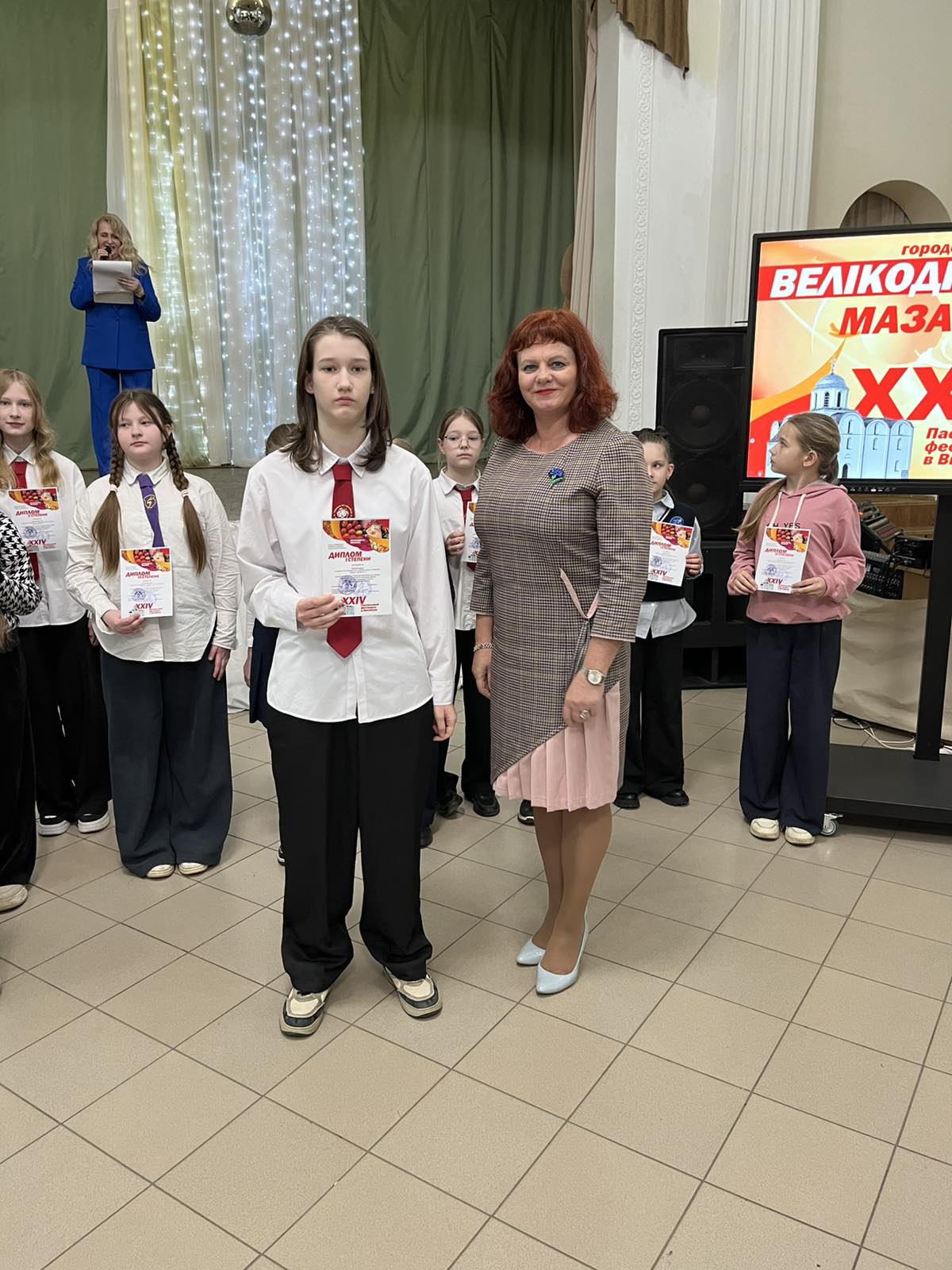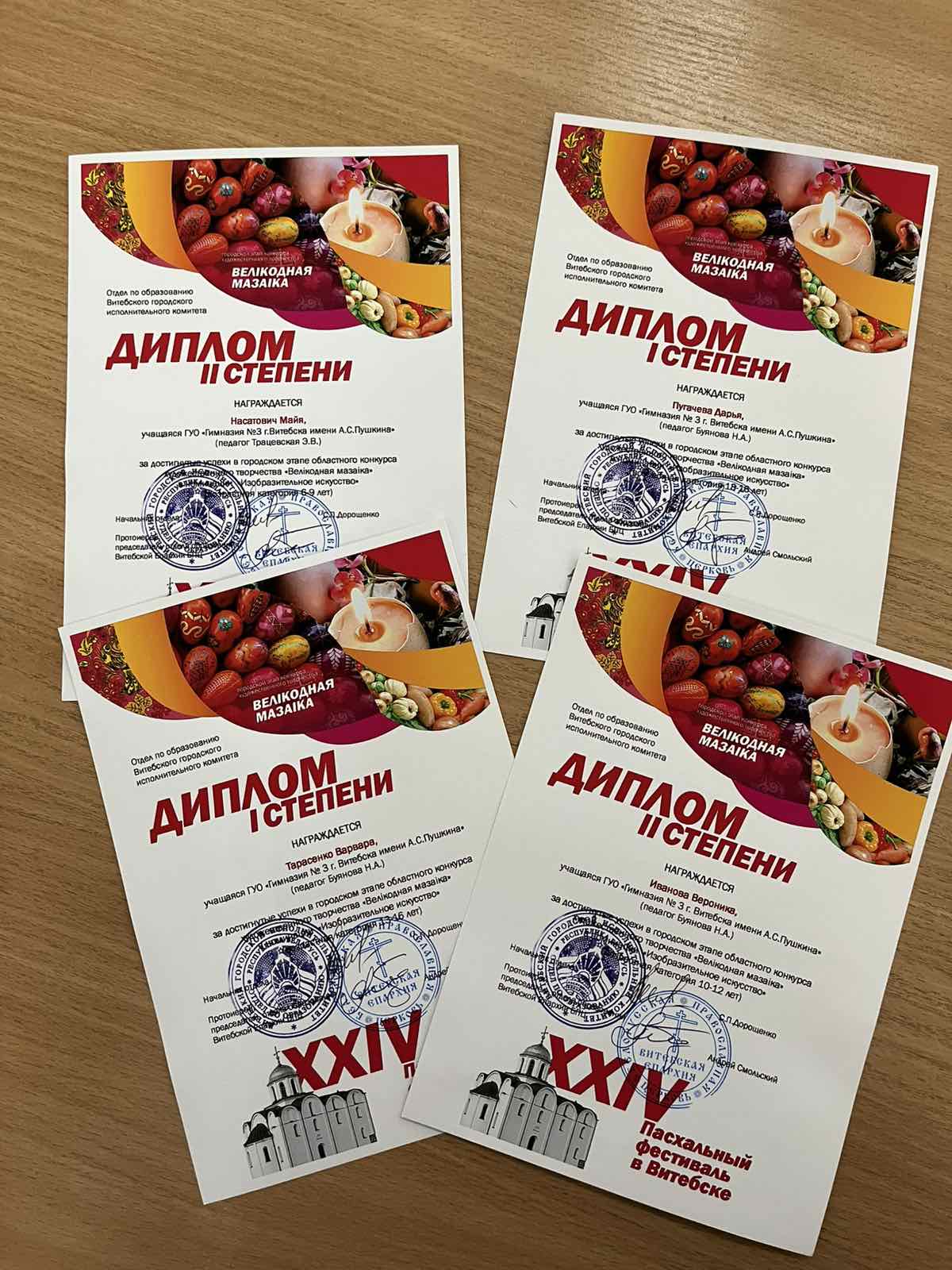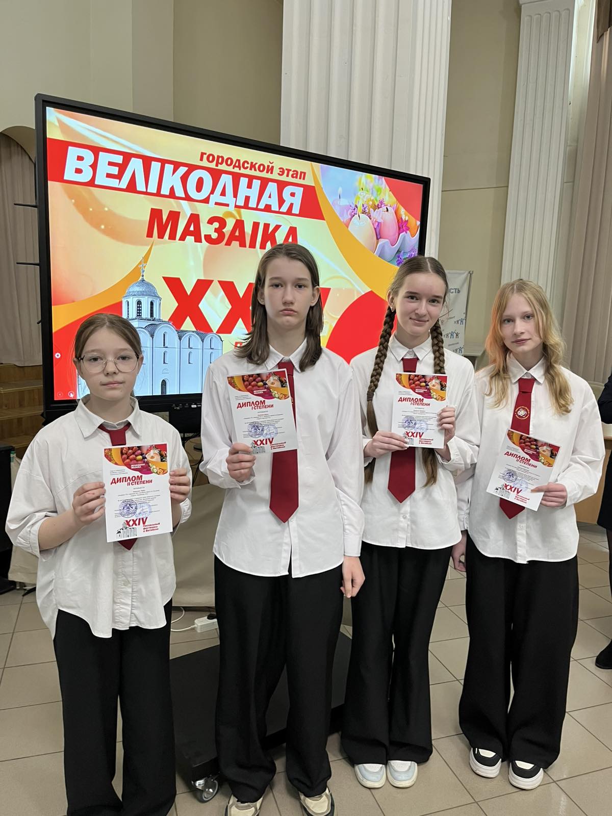 Поздравляем победителей городского этапа областного конкурса»Великодная мазаика» в номинации «Изобразительное искусство» Пугачёву Дарью — диплом 1 степени, Тарасенко Варвару — диплом 1 степени, Иванову Веронику — диплом 2 степени, и их учителя Буянову Наталью Анатольевну, а также Насатович Майю — диплом 2 степени и её учителя Трацевскую Эльвиру Вильгельмовну!