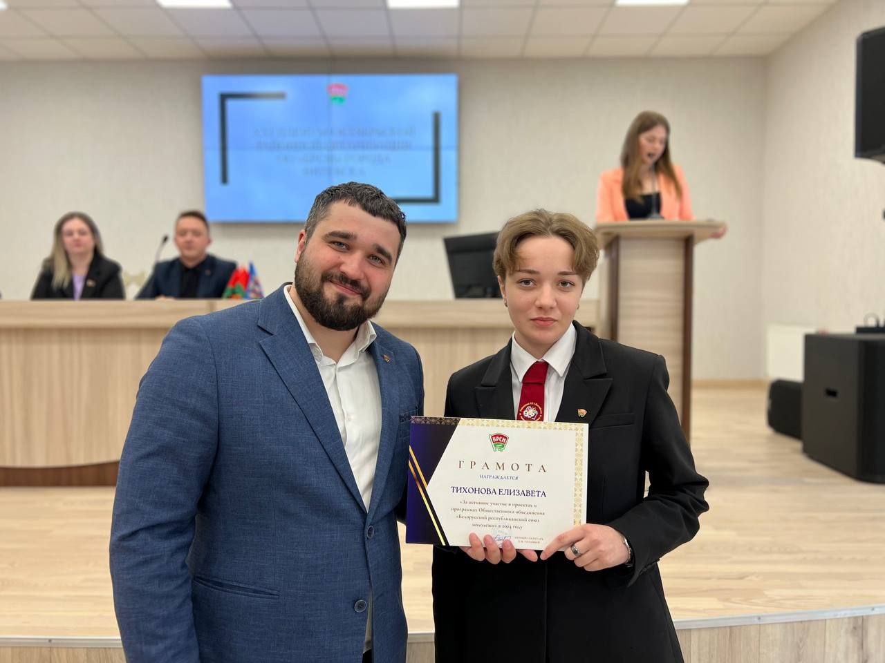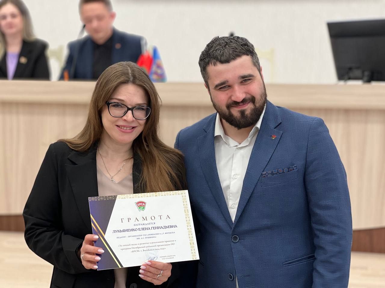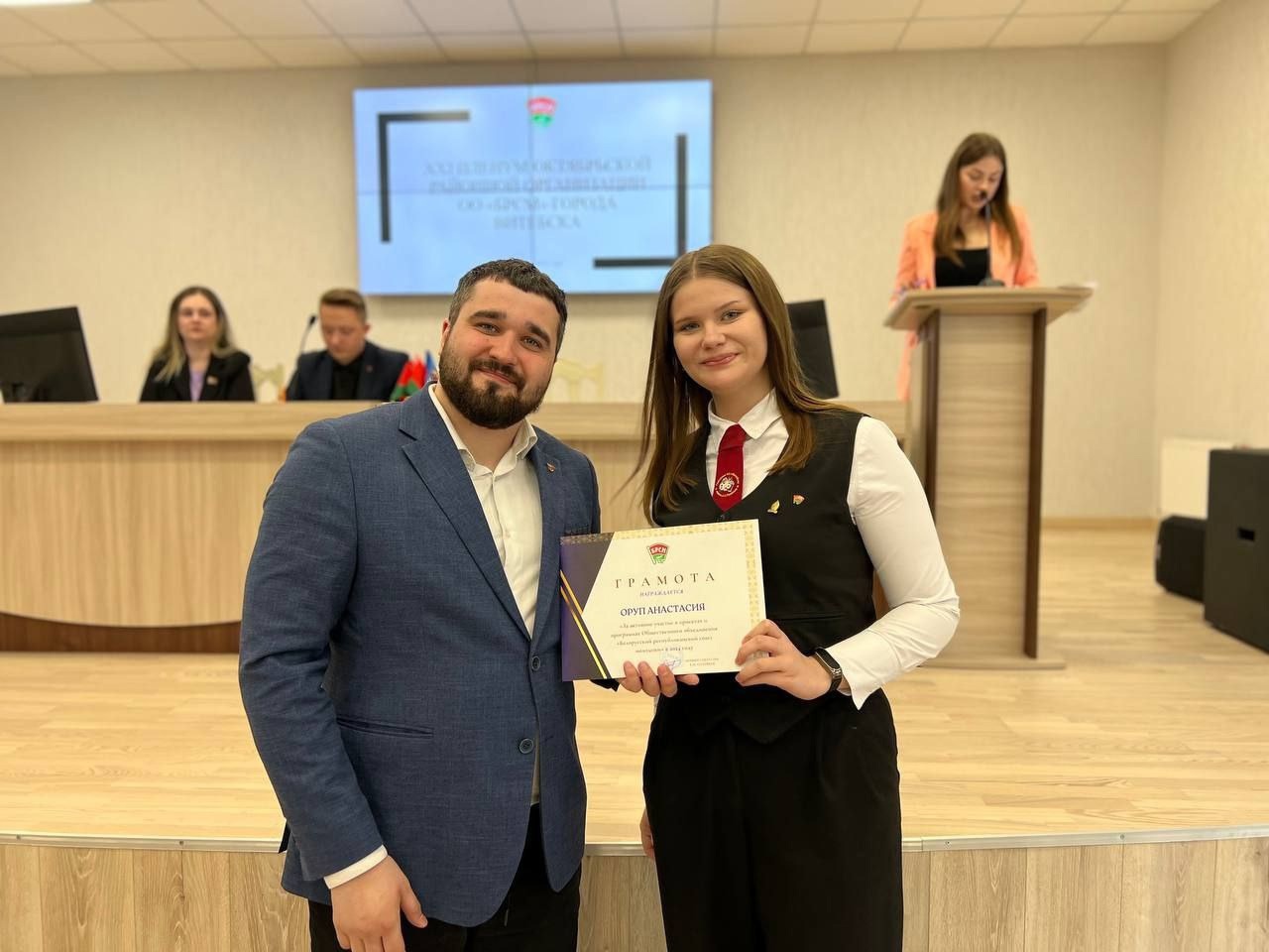 09.04.2025На XXI Пленуме Октябрьской районной организации ОО «БРСМ» первичная организация гимназии № 3, ее куратор — педагог-организатор Лукьяненко Е.Г., волонтеры и активисты союза молодежи Барановская Варвара, Оруп Анастасия, Тихонова Елизавета, Рыбакова Катерина, Хороща Анна, Чахович Дарья и Довгаль Маргарита награждены грамотами за активное участие в проектах и программах ОО «БРСМ» в 2024 году.
