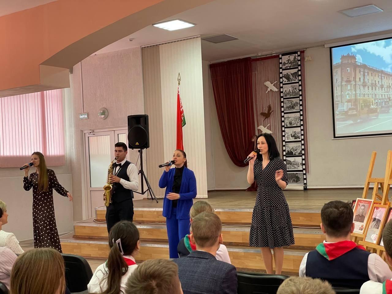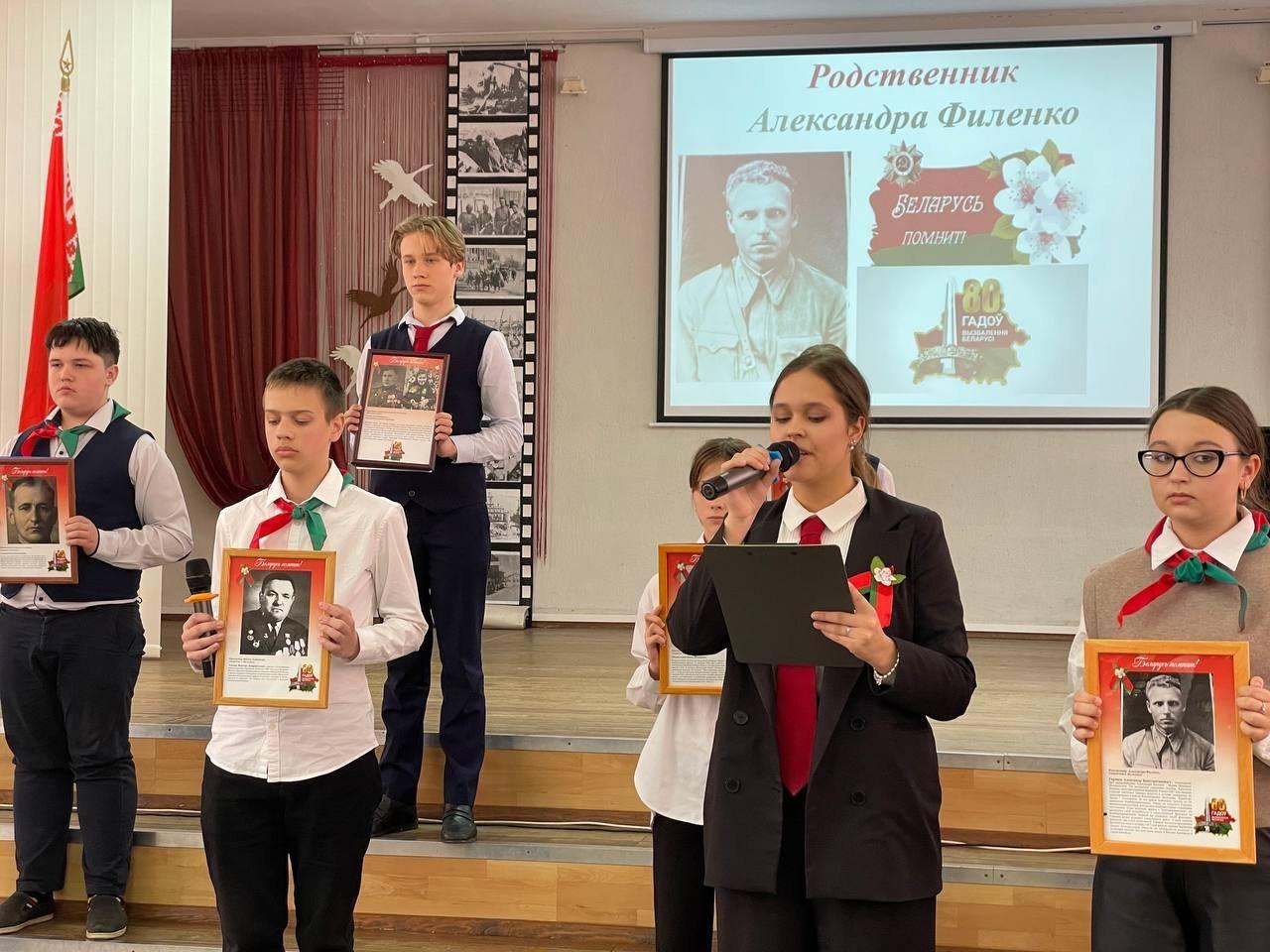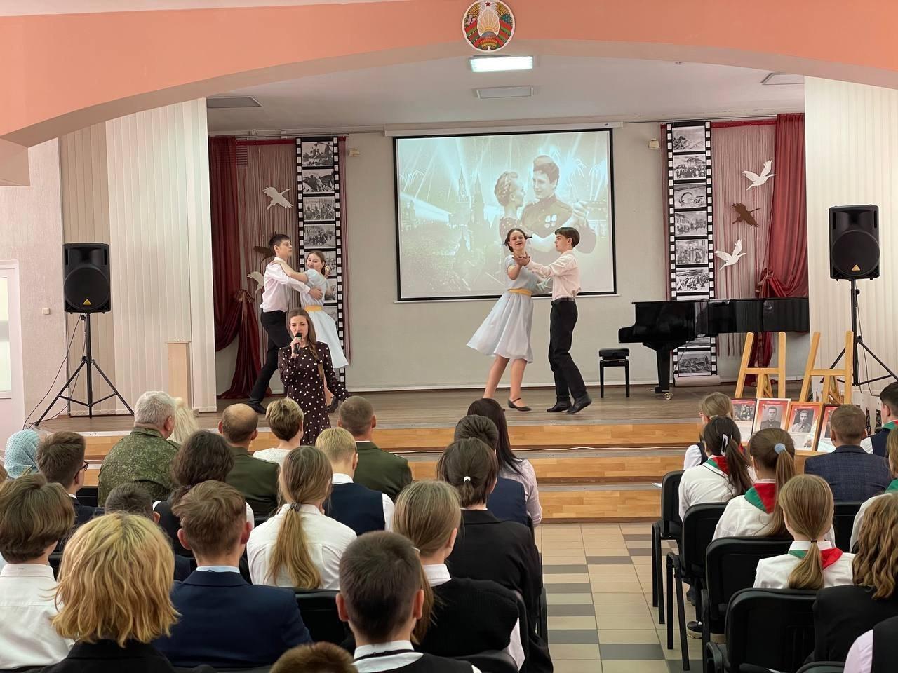 07.05.2024Ежегодно в преддверии праздника Дня Победы новые имена появляются на Доске Памяти «В строю всегда, в памяти навечно!». В рамках праздничной программы «Во имя мира» гимназисты собрались в актовом зале, рассказали о подвигах своих прадедов, представили презентации на основе семейных архивов. С Днем Победы всех присутствующих поздравила председатель Октябрьской районной организации Белорусского общественного объединения ветеранов г.Витебска Н.В. Лепёшкина, а директор гимназии Е.А. Матвеева и в торжественной обстановке вручила учащимся подарочные издания книги «Я — гражданин Республики Беларусь».