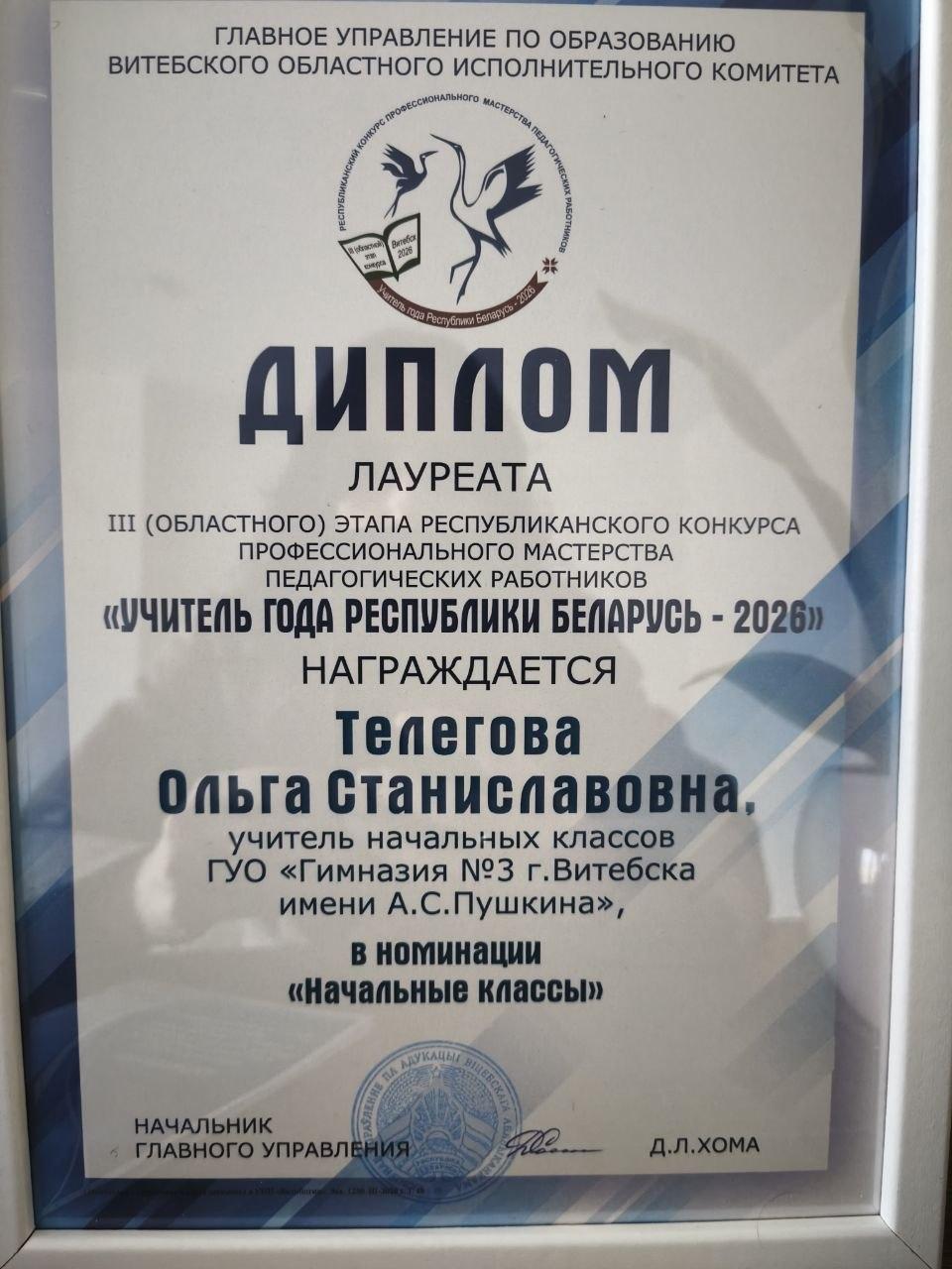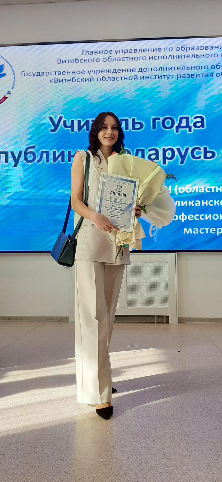 Особое поздравление Телеговой Ольге Станиславовне. Она стала лауреатом областного этапа республиканского конкурса профессионального мастерства педагогических работников «Учитель года Республики Беларусь».