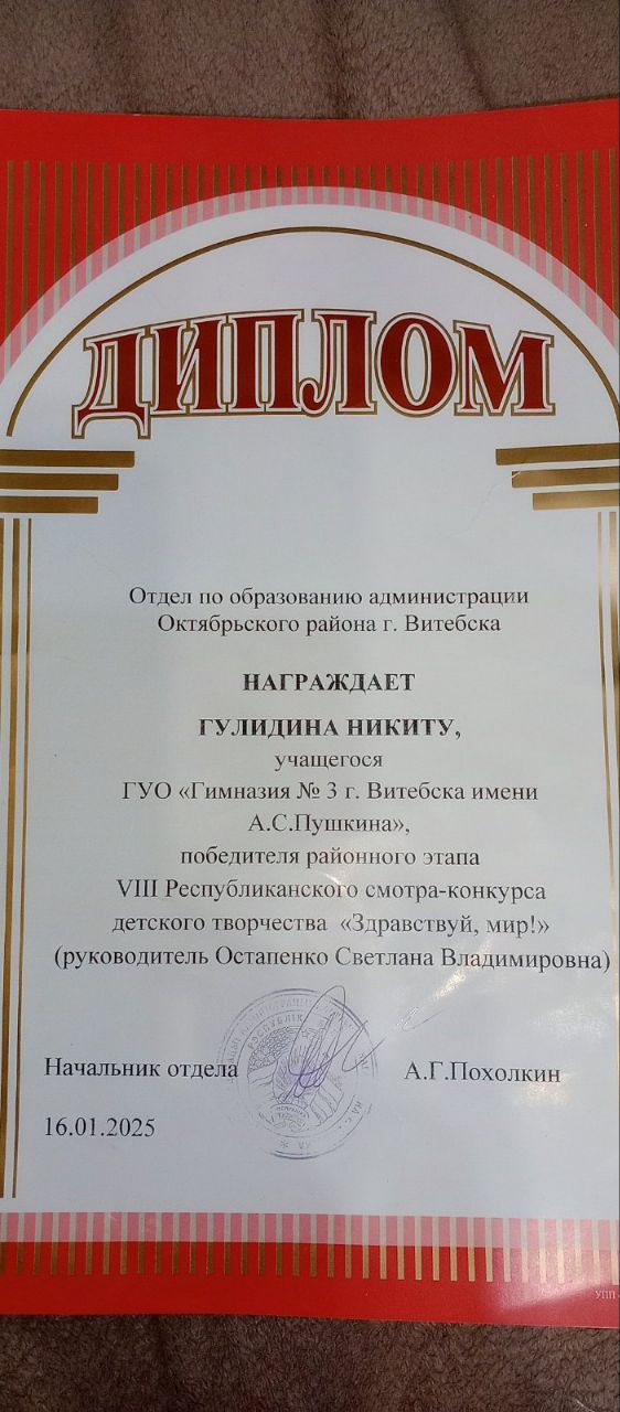 - дипломом лауреата победителя районного этапа VIII Республиканского смотра-конкурса детского творчества «Здравствуй, мир!»,