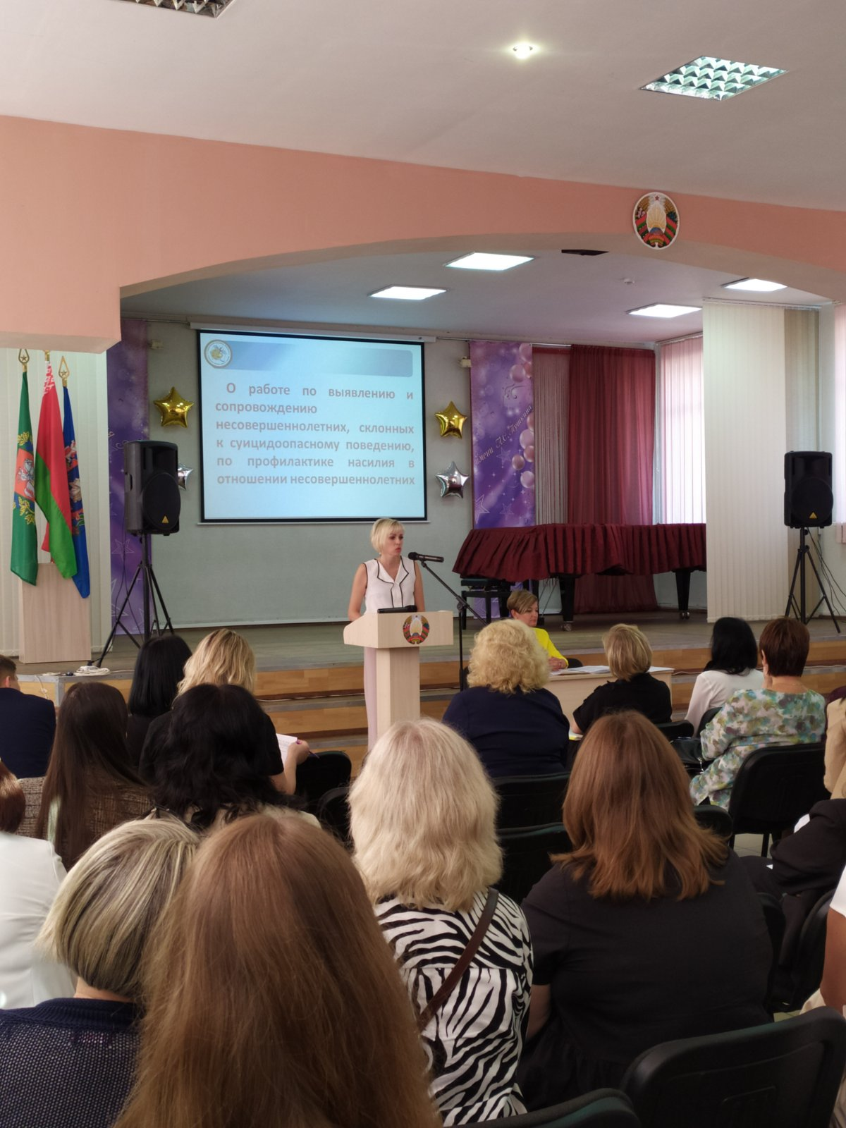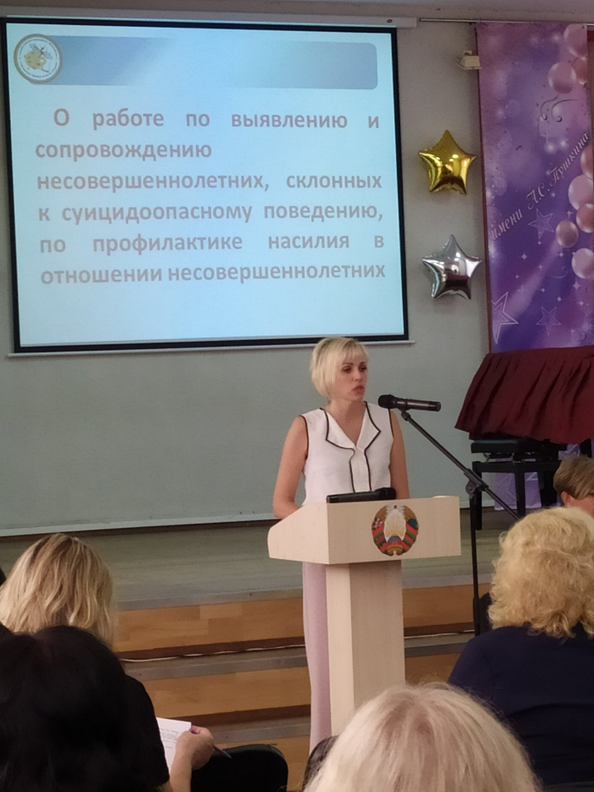 3.09.2025 педагог -психолог Янковская выступила перед педагогическим как с вопросом «О работе по выявлению и сопровождению несовершеннолетних, склонных к суицидоопасному поведению