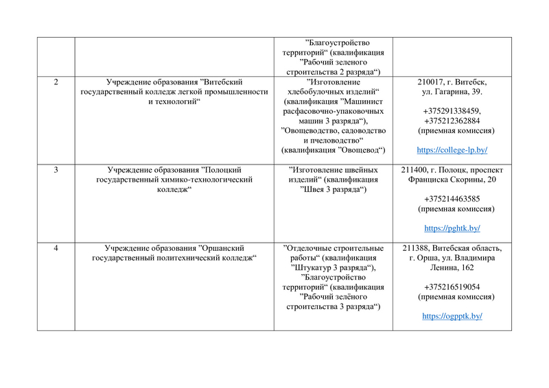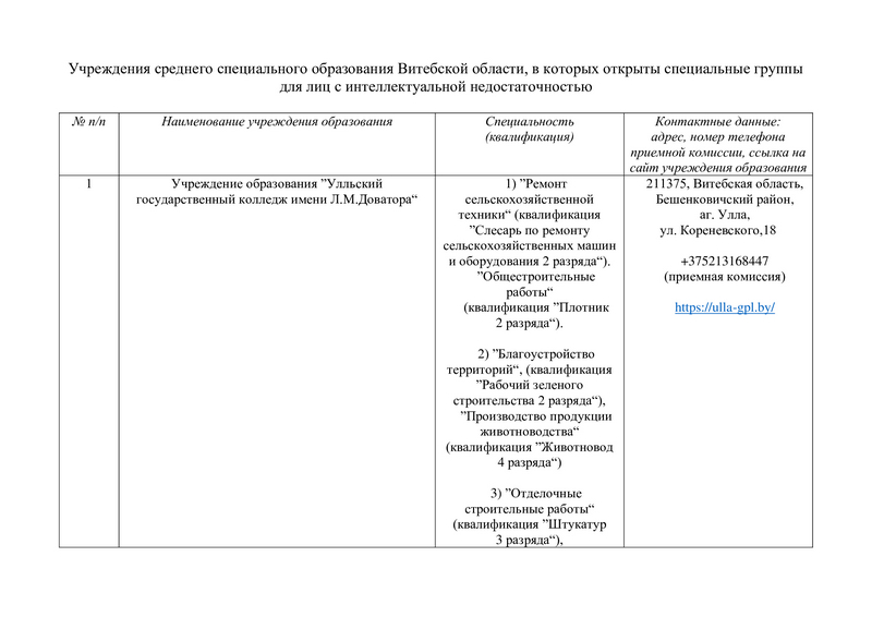 Учреждения среднего специального образования Витебской области, в которых открыты специальные группы для лиц с интеллектуальной недостаточностью