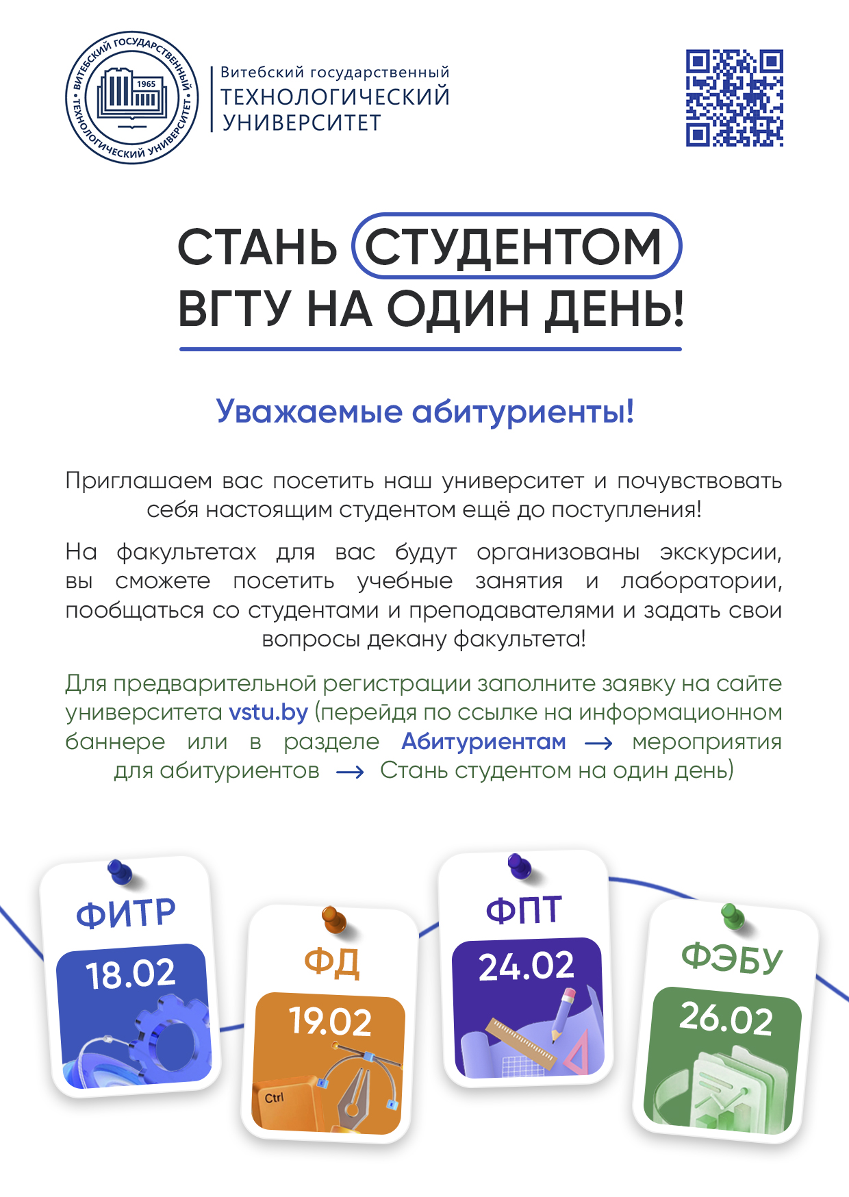 Учреждение образования «Витебский государственный технологический университет в феврале 2026 года проводит профориентационное мероприятие «Стань студентом на один день» по факультетам.