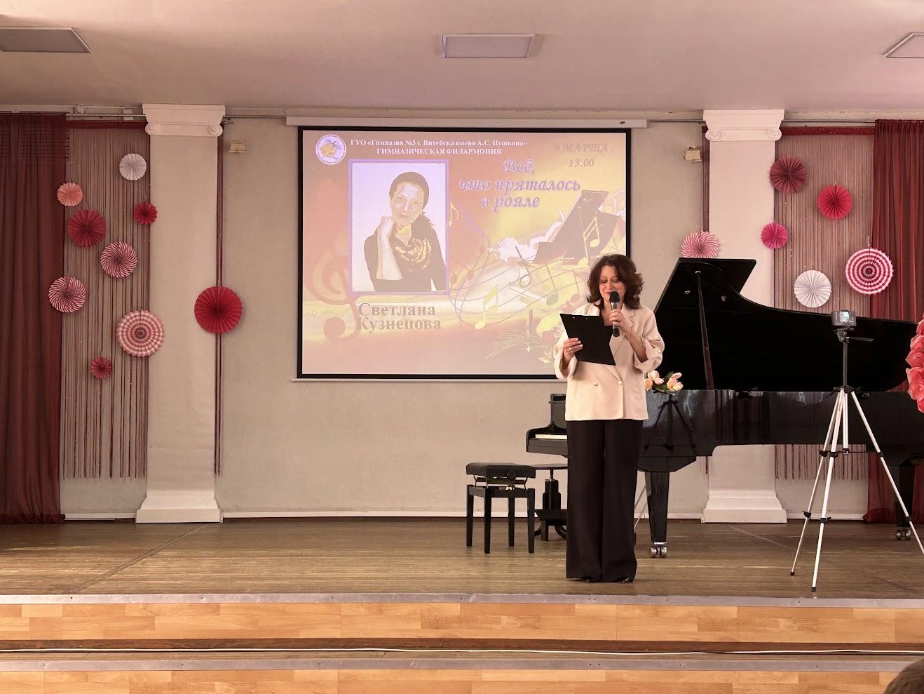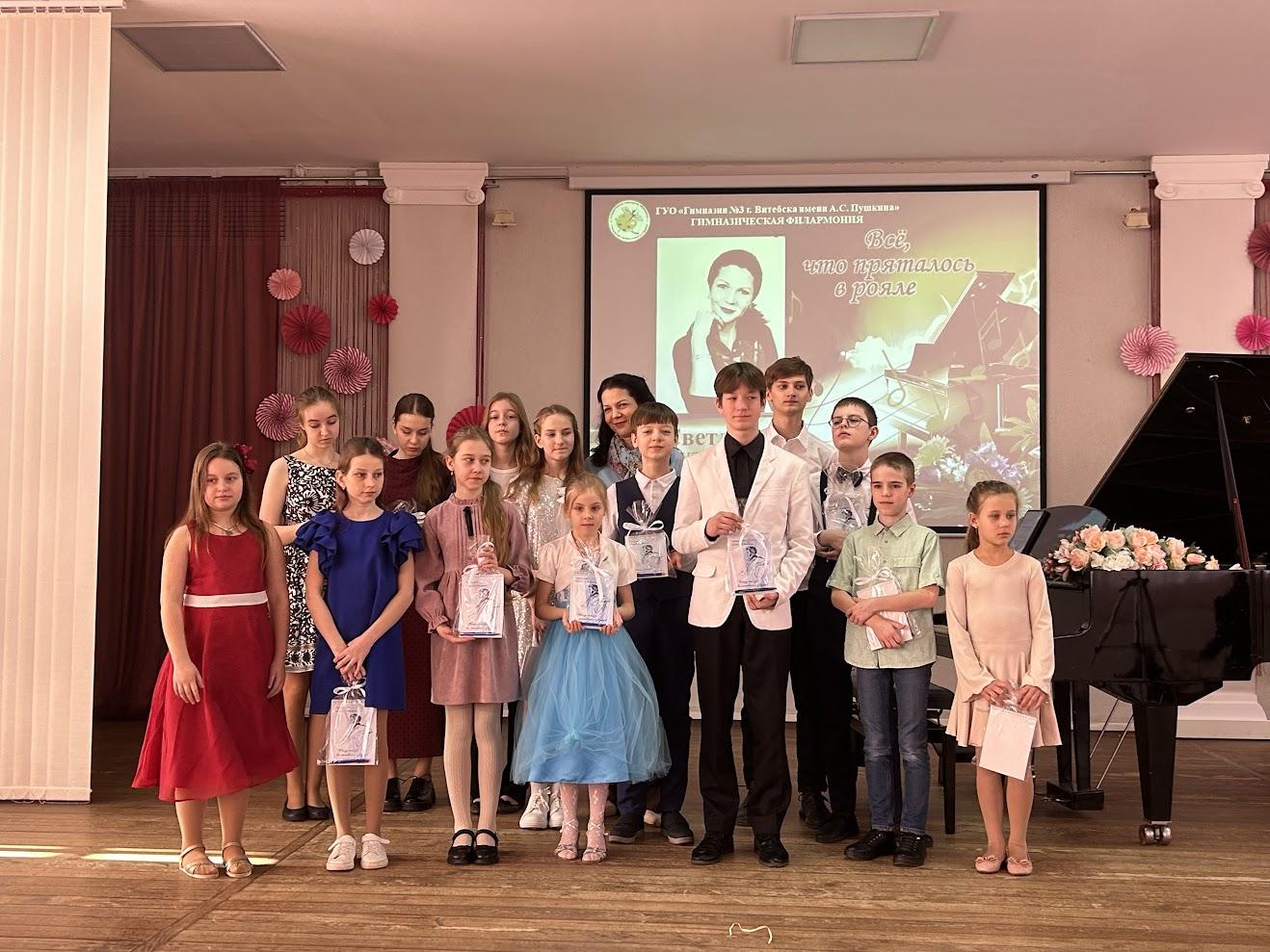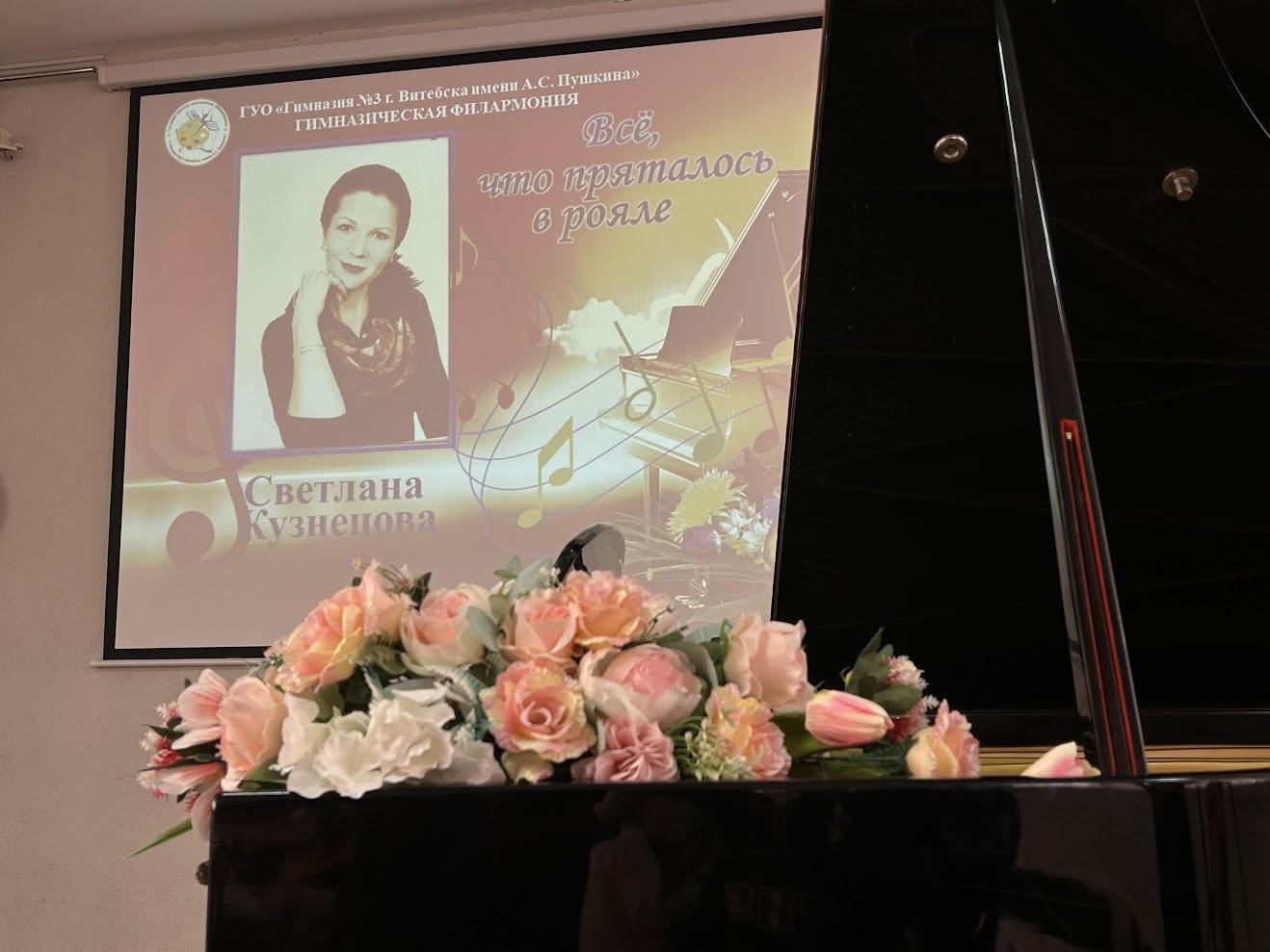 Творческая встреча «Всё, что пряталось в рояле» стала настоящим диалогом поколений и городов. Светлана Юрьевна привезла с собой своих учеников из минской гимназии №15, а на сцене рядом с ними выступали витебские гимназисты. Вместе они открывали тайны рояля, исполняя музыку, которую сочинила Светлана Юрьевна.